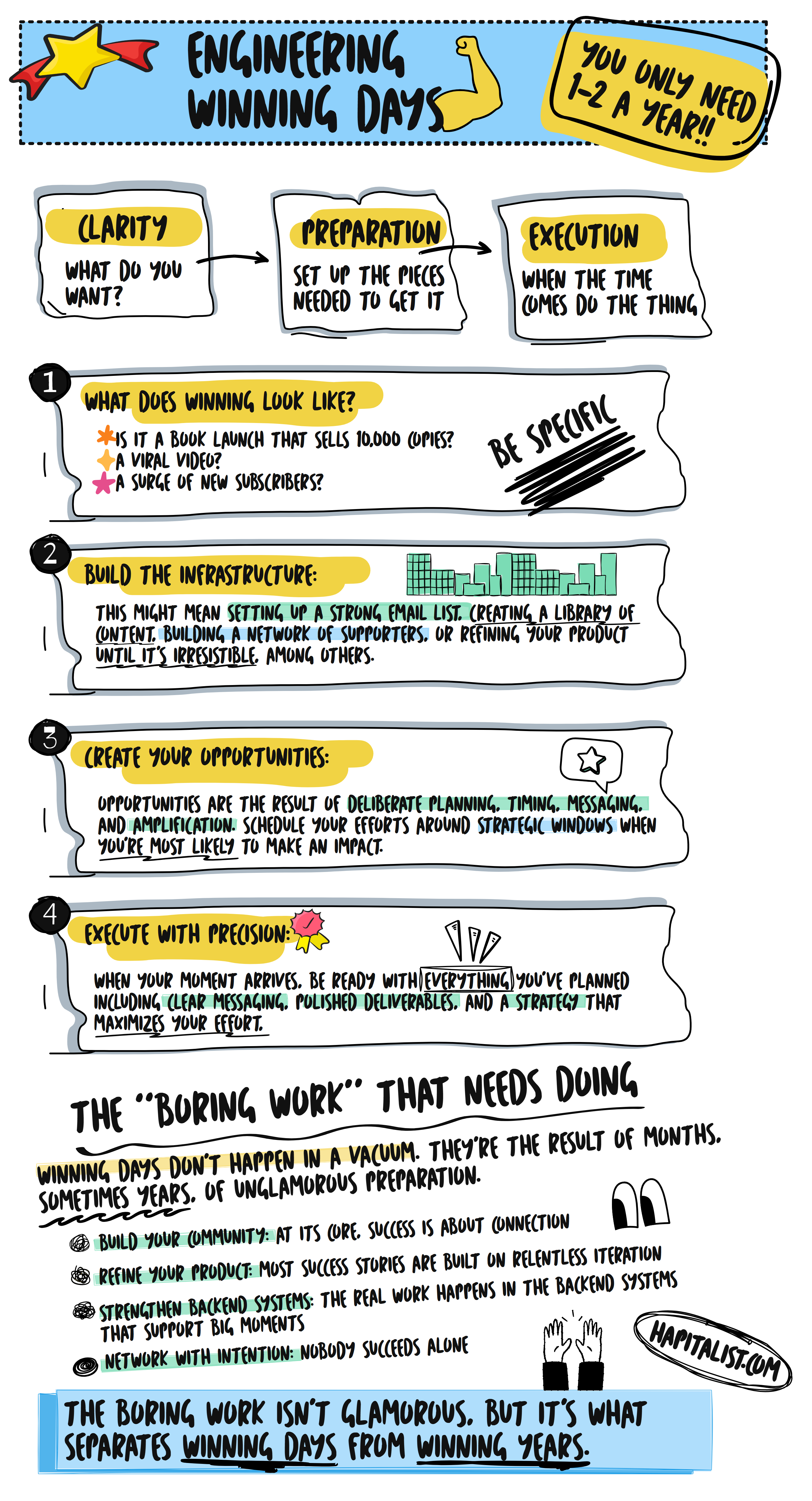 Build the infrastructure: Winning days require a foundation. This might mean setting up a strong email list, creating content that resonates with your audience, building a network of supporters, or refining your product until it’s irresistible.