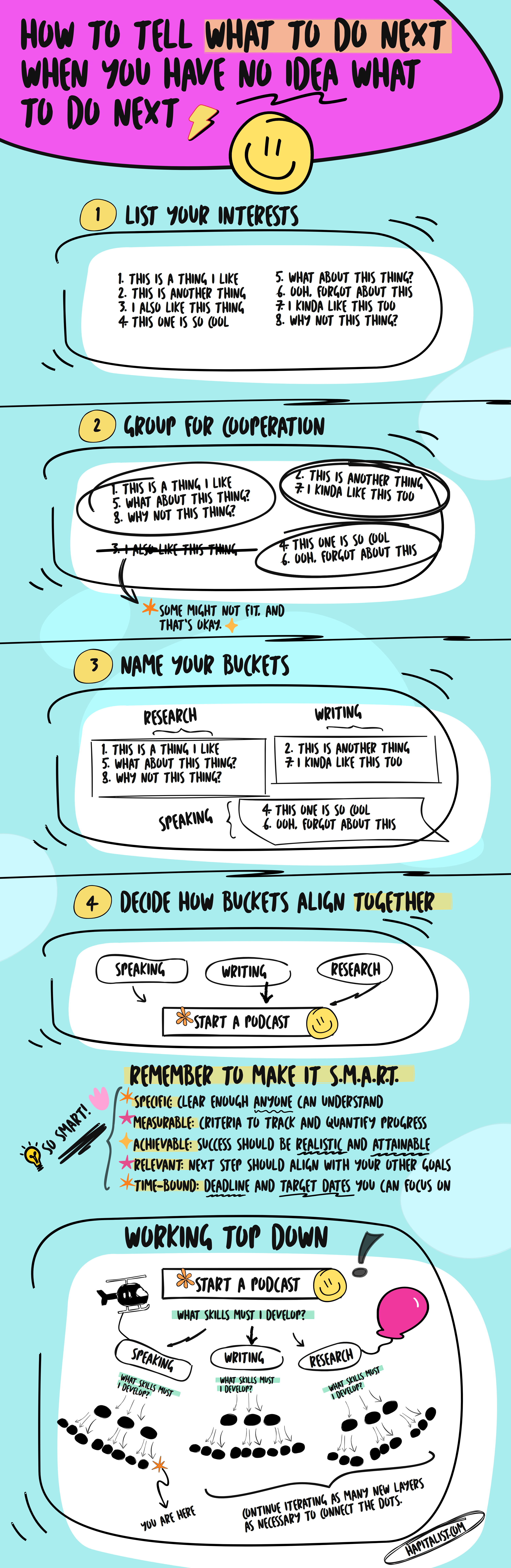 So far, we’ve talked about working bottom up by starting with what interests you, grouping it into buckets, seeing what aligns, and letting the next domino emerge from the work itself.