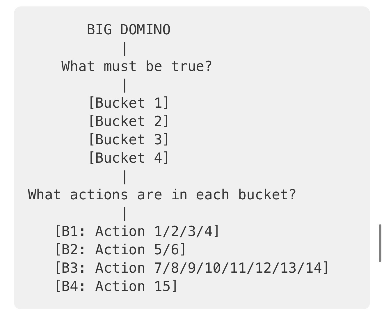 When buckets truly aligns, they should point in one plausible direction. Once they do, you do the work to execute the tasks in those buckets, trying to knock over that domino.