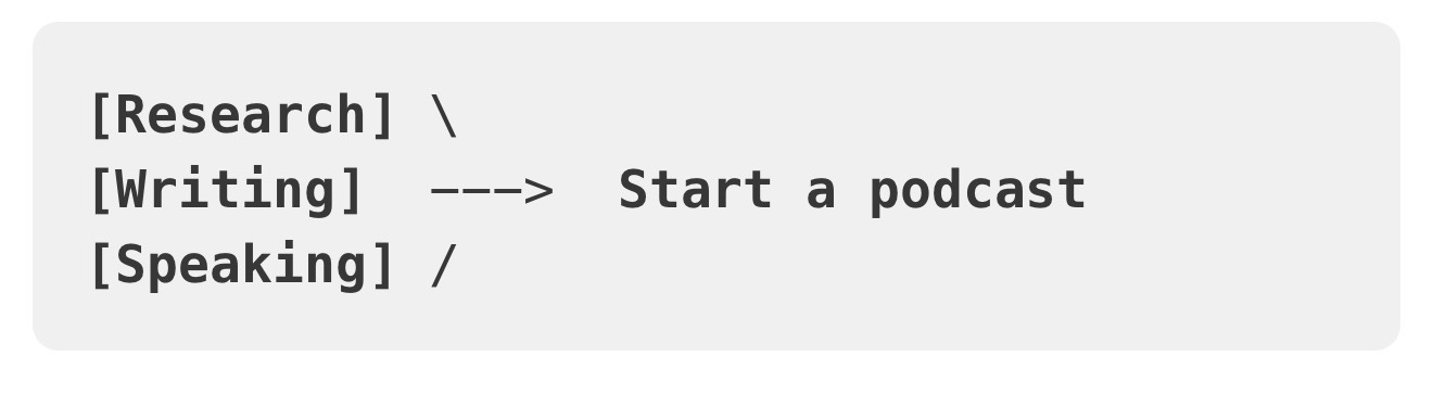 For example, “speaking at a conference” isn’t a singular event. It’s the result of a hundred little things that happened to get you there. The more of those actions that align together, the more quickly you can move and the fewer steps it takes to achieve.
