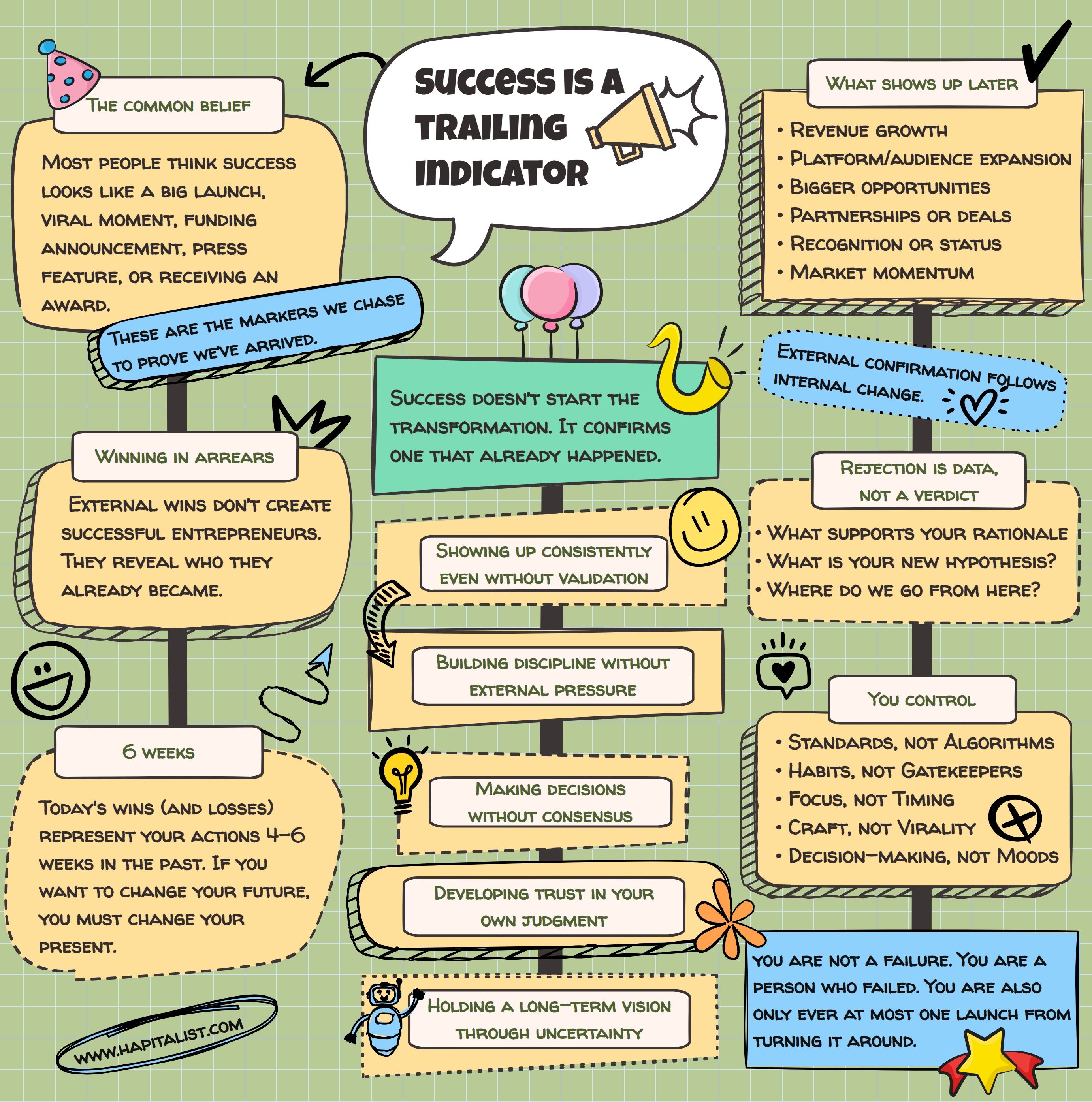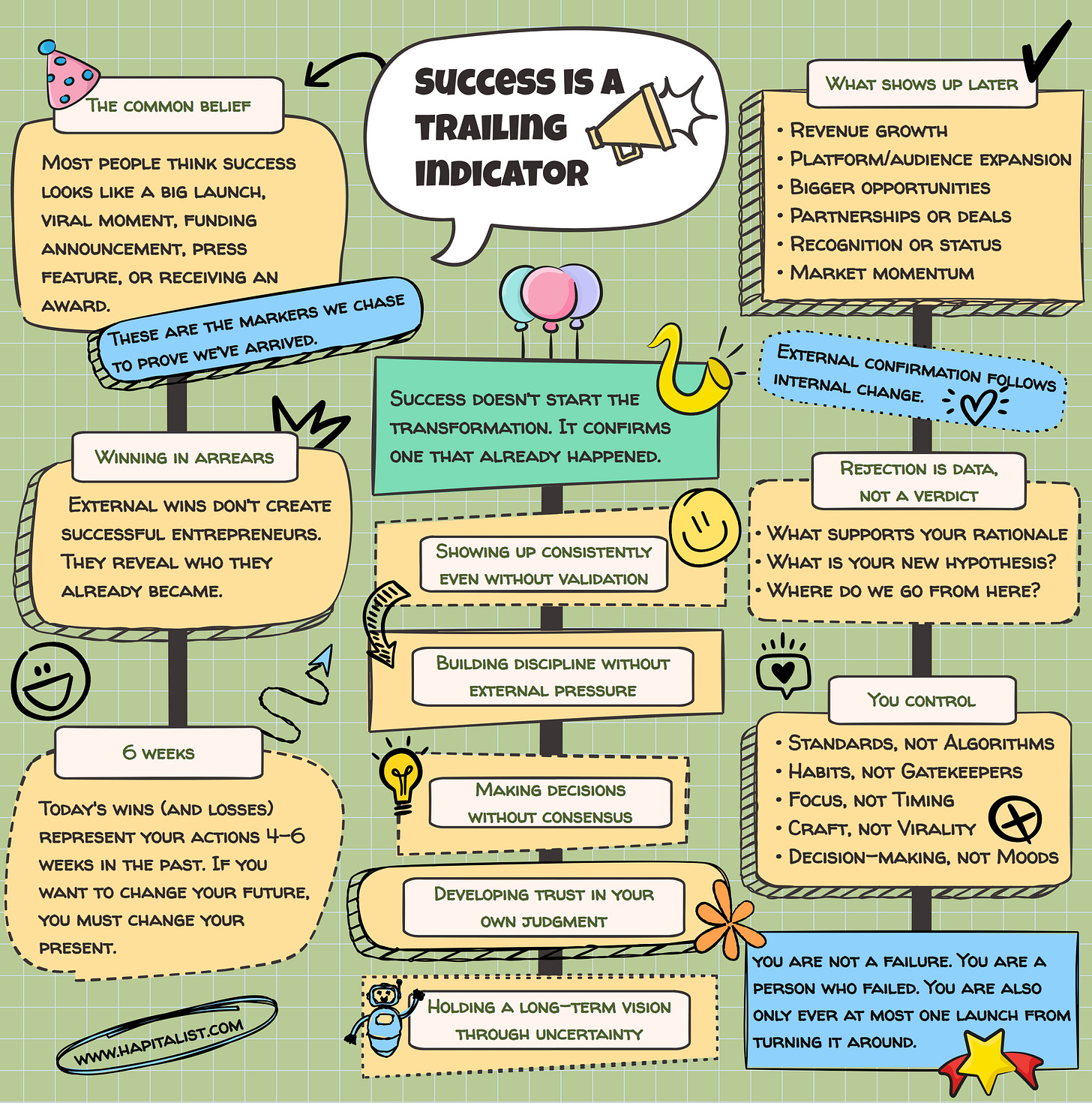 It changes how you relate to other’s success, too. When a colleague lands the deal you wanted, you can recognize that their external success is trailing behind internal work you didn’t witness. Their trajectory says nothing about yours. Your leading indicators are just operating on their own timeline.